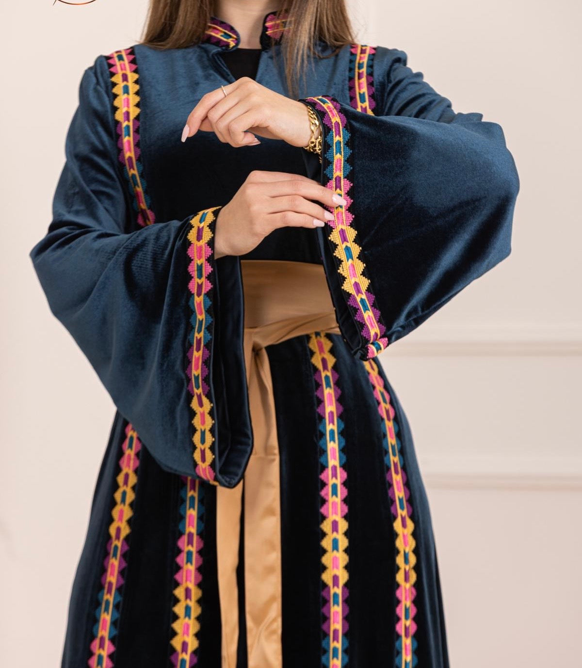 Blue Velvet Elegance Stripes Embroidered Dress with Satin Belt