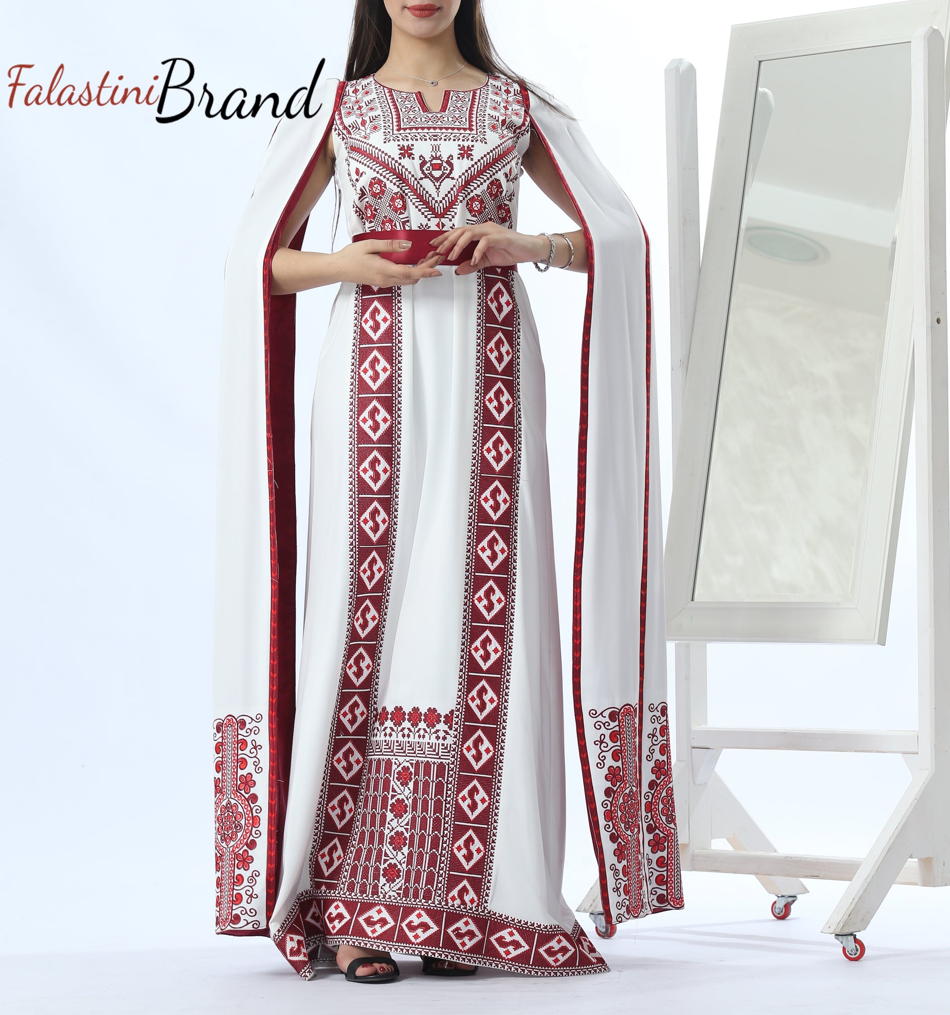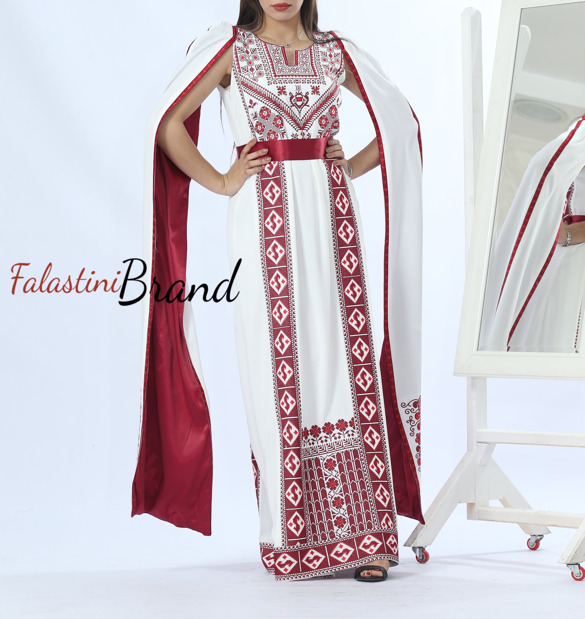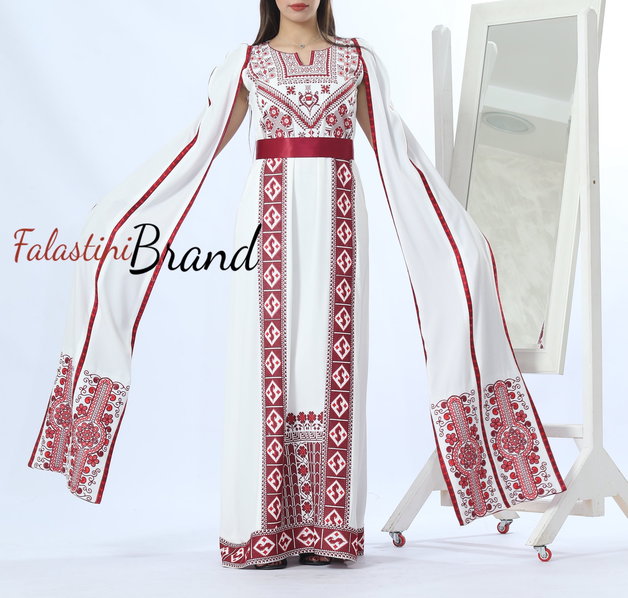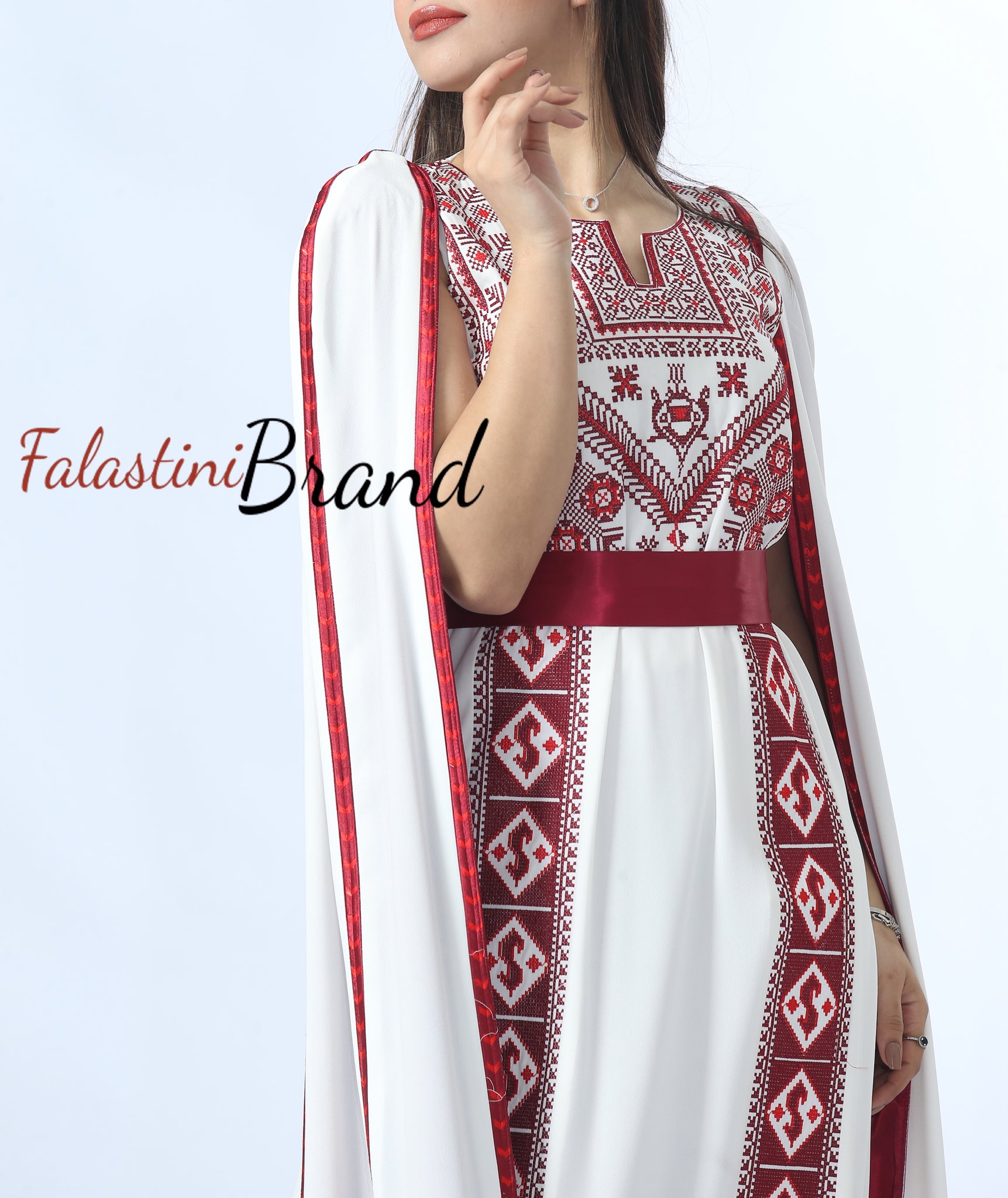 Stunning White And Burgundy Royal Sleeve Palestinian Embroidered Dress