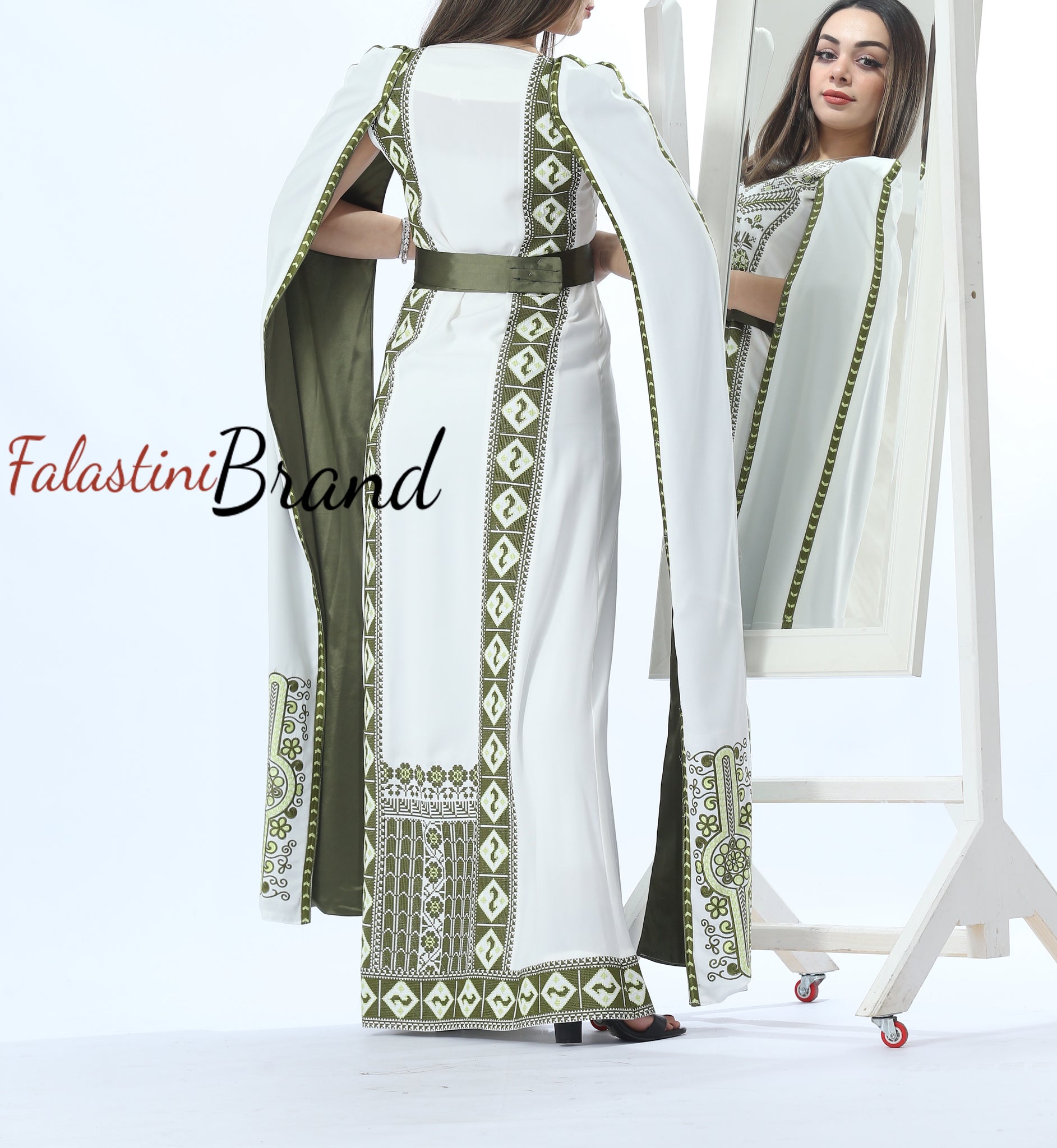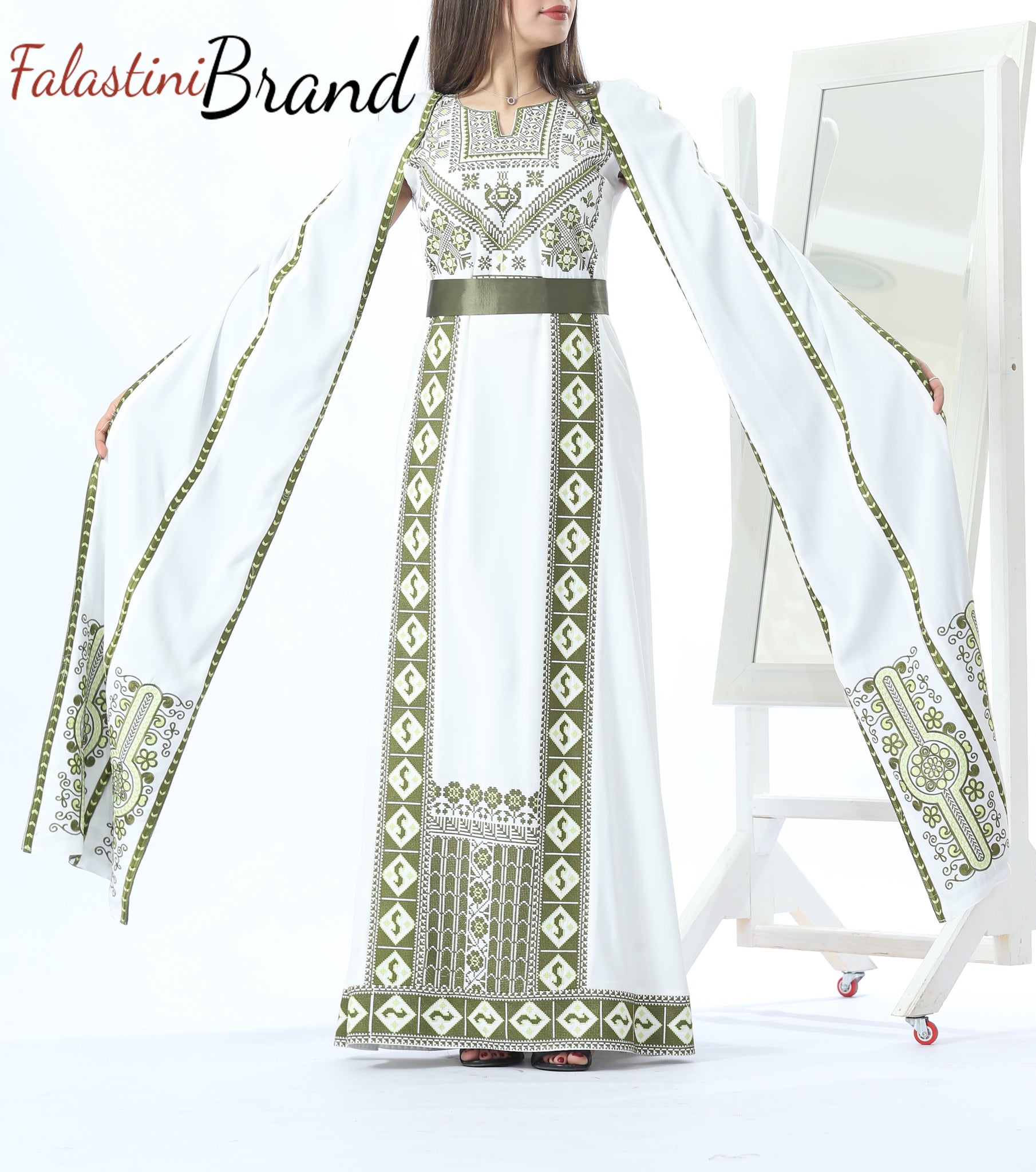 Stunning White And Green Royal Sleeve Palestinian Embroidered Dress