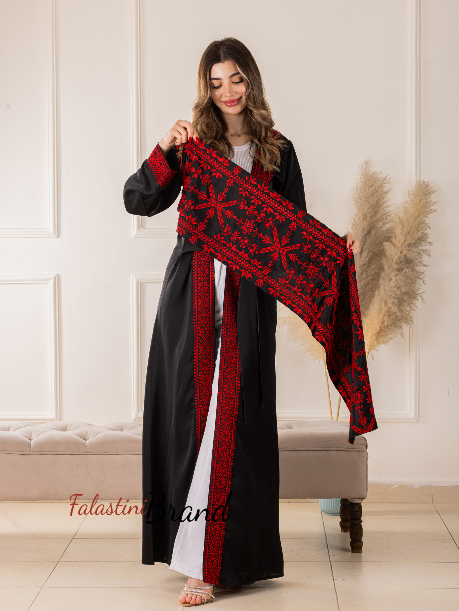 Trending Palestinian Black Satin Embroidered Open Abaya with Attached Embroidered Drape