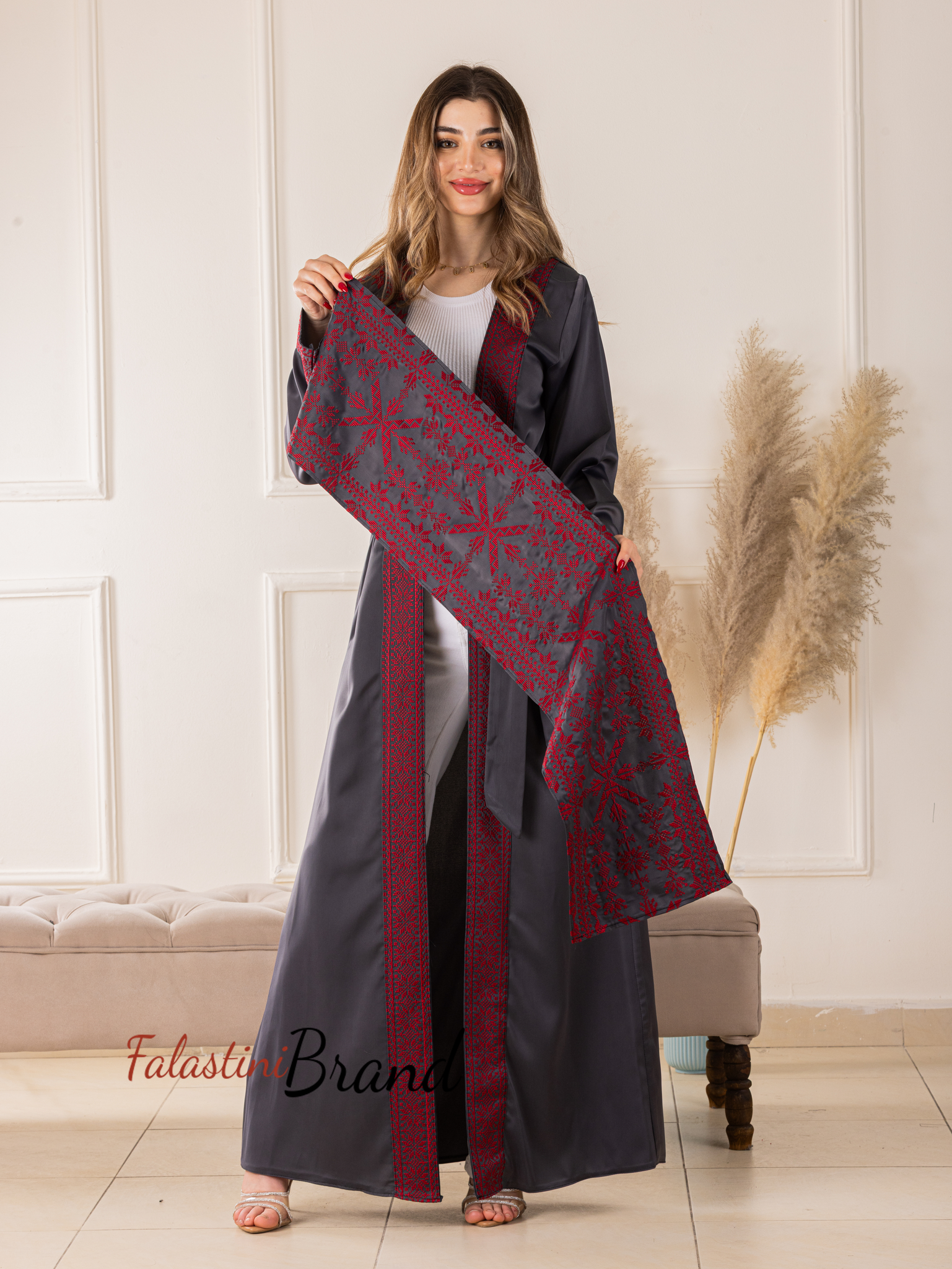 Trending Palestinian Grey Satin Embroidered Open Abaya with Attached Embroidered Drape