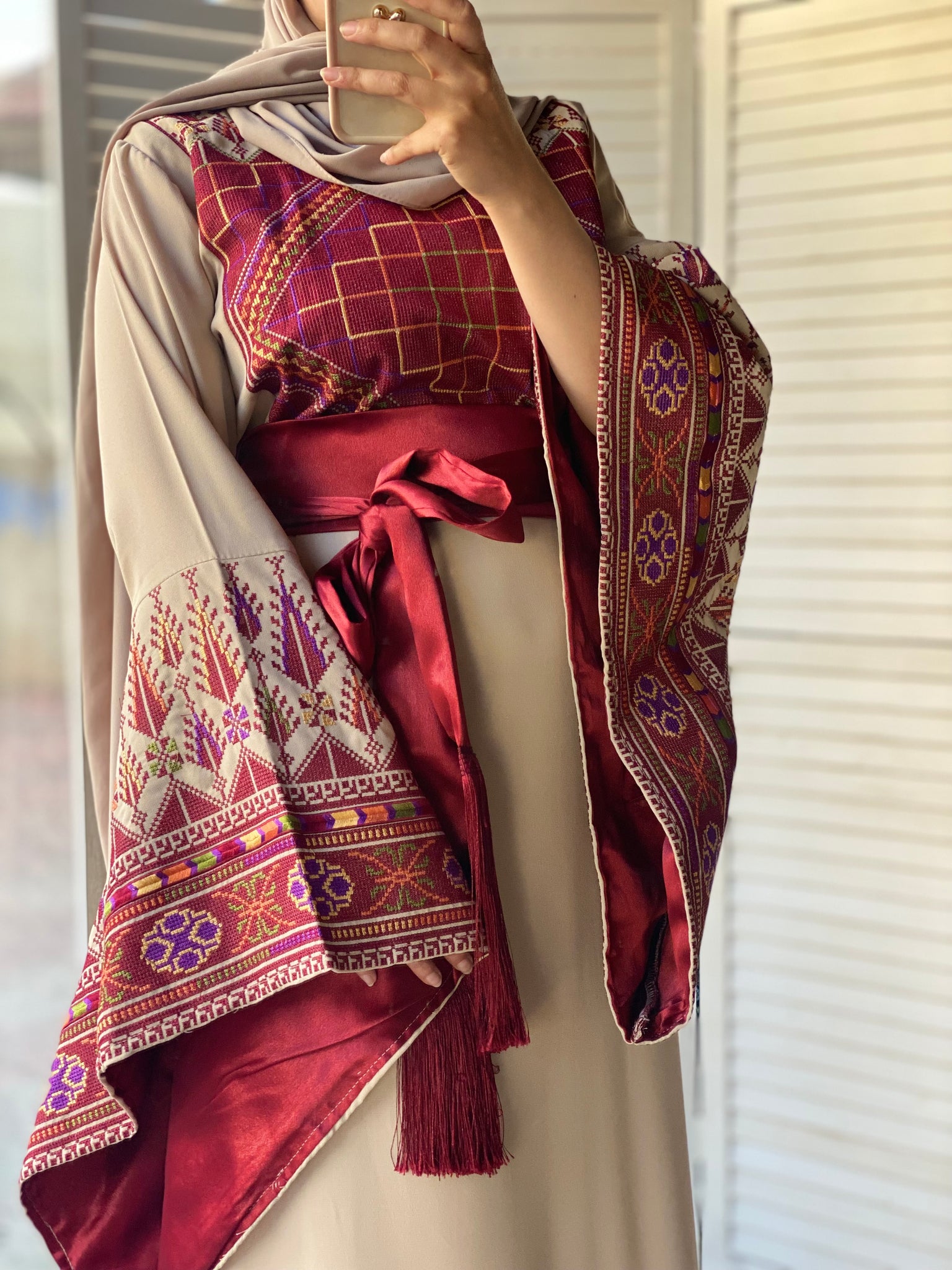Very Unique Radan Sleeves Beige and Burgundy Thobe with Dense Embroidery and Satin Details