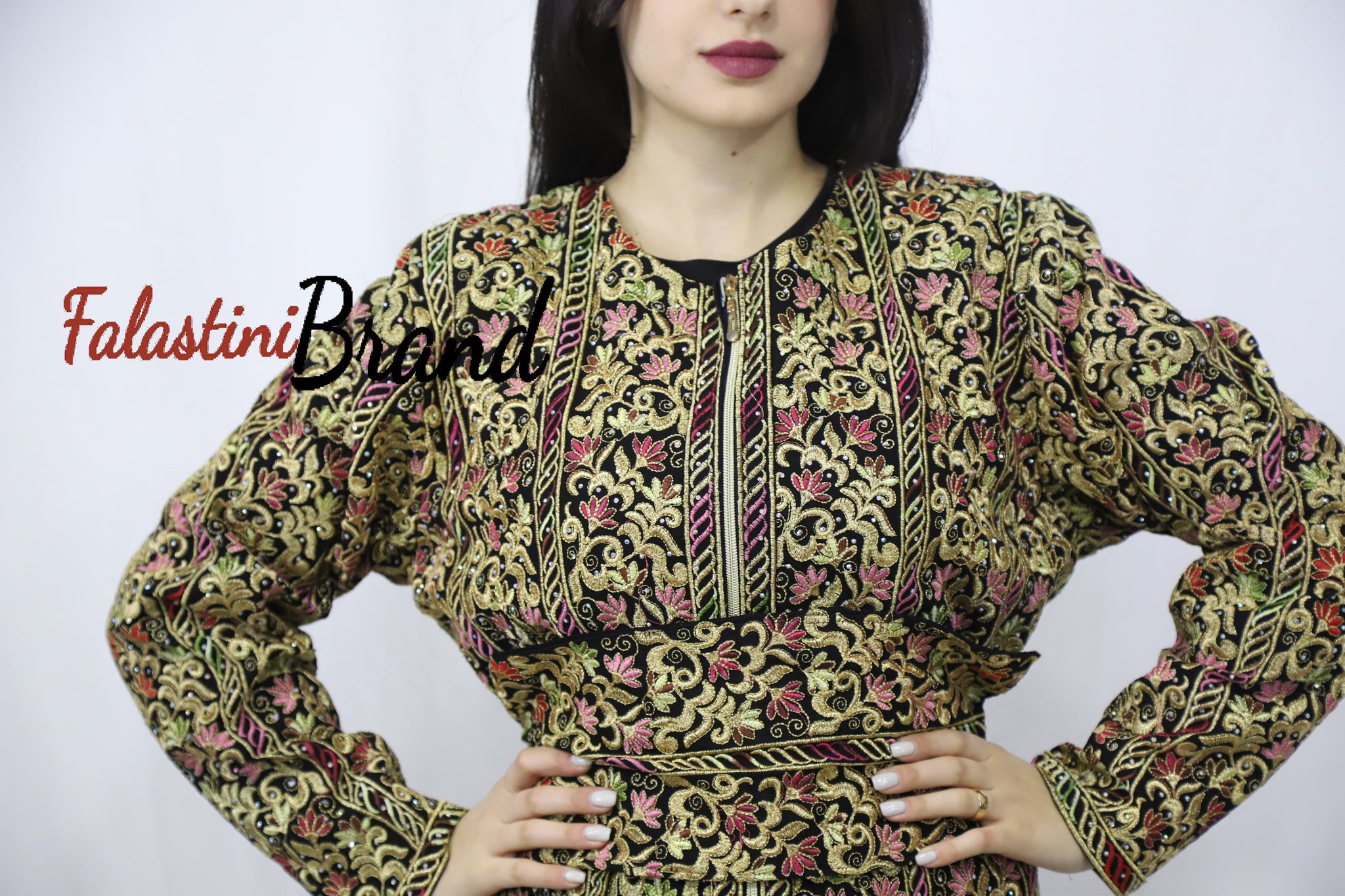 Amazing Metallic Golden and pink Threads Palestinian Embroidered Thobe Dress Long Sleeve